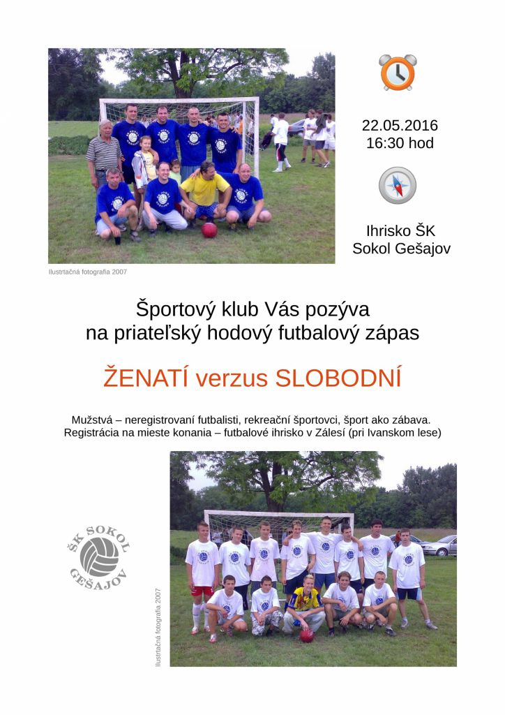 Hodový zápas 22.5.2016 o 16.30 hod sa na ihrisku ŠK Sokol Gešajov uskutoční priateľský futbalový zápas Ženatí verzus Slobodní