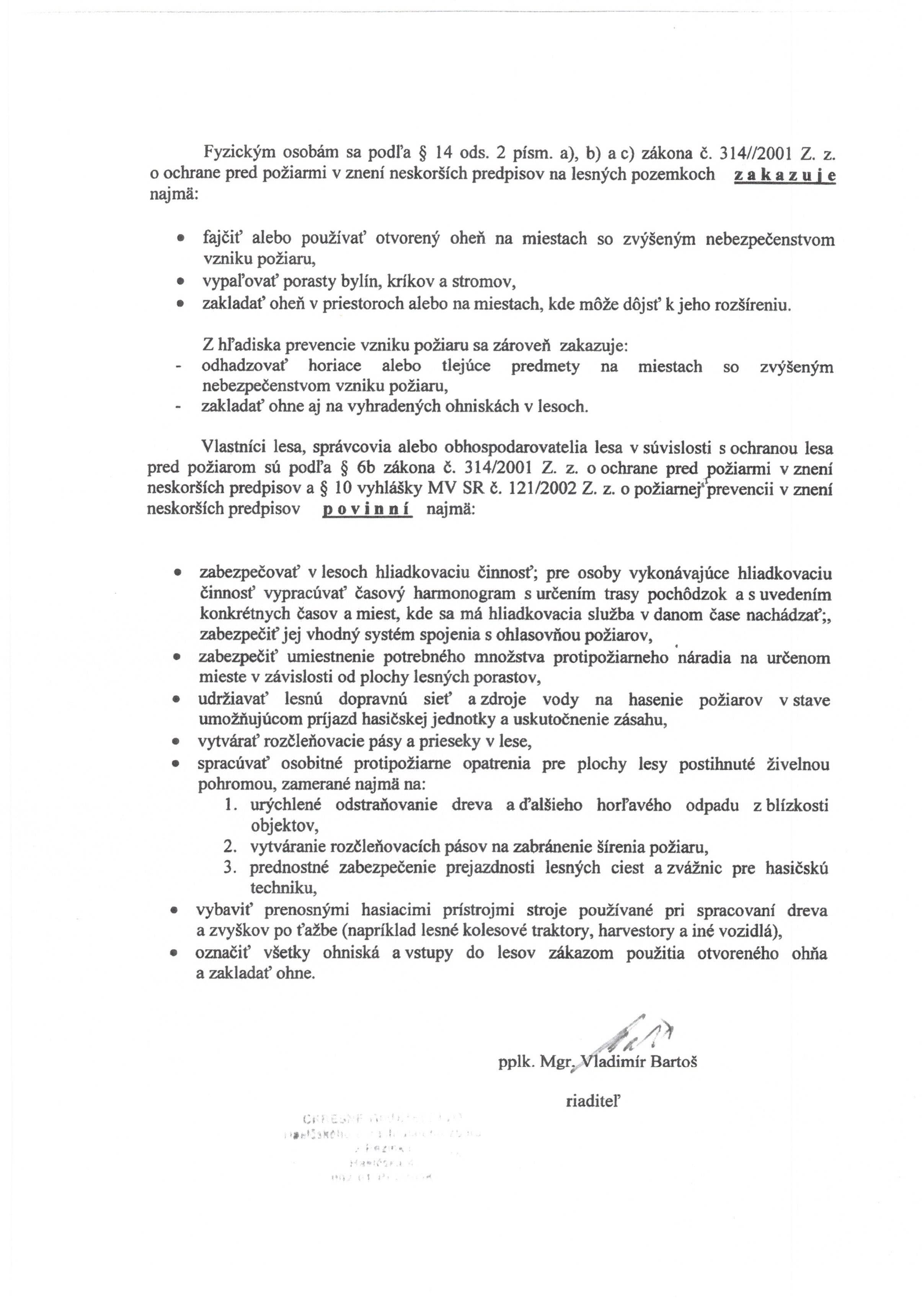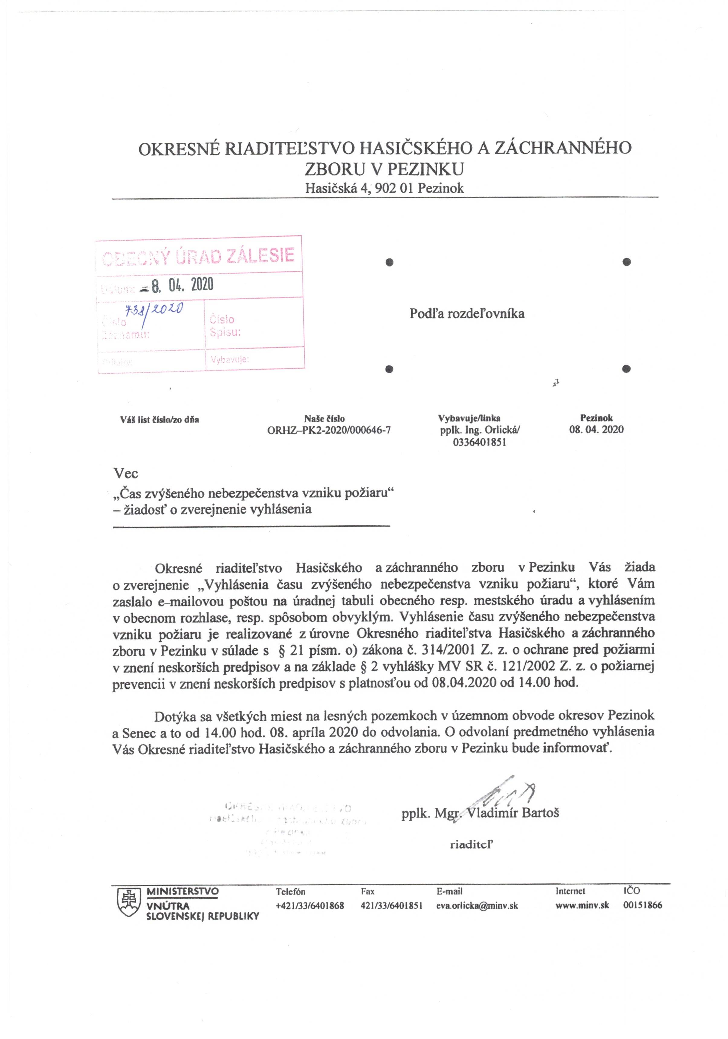 Oznam čas zvýšeného nebezpečenstva vzniku požiaru