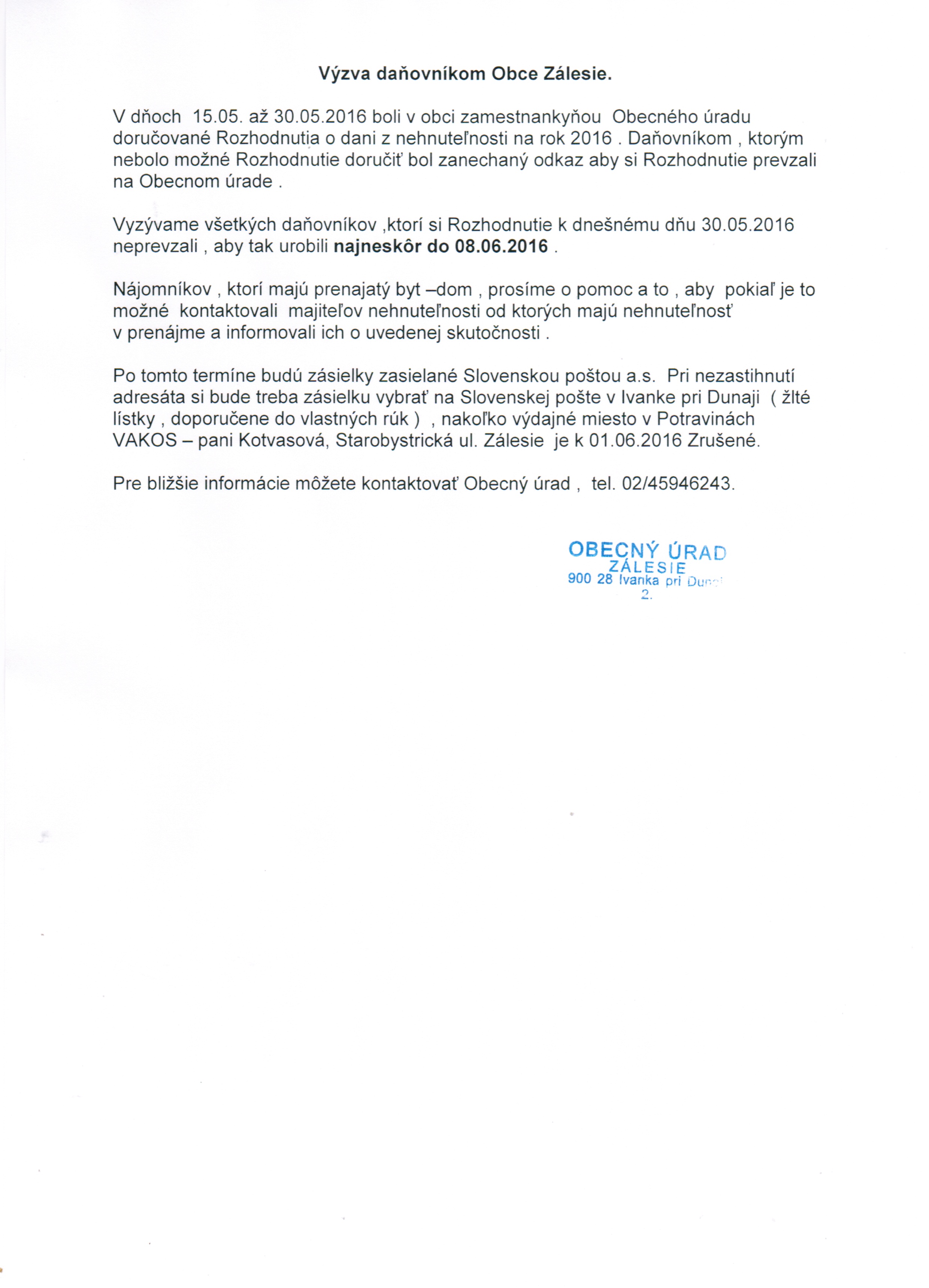 erb obce Zálesie Obecný úrad Zálesie vyzýva daňovníkov na prevzatie Rozhodnutí o dani z nehnuteľnosti na rok 2016 . Bližšie informácie sú uvedené v priloženom súbore .
