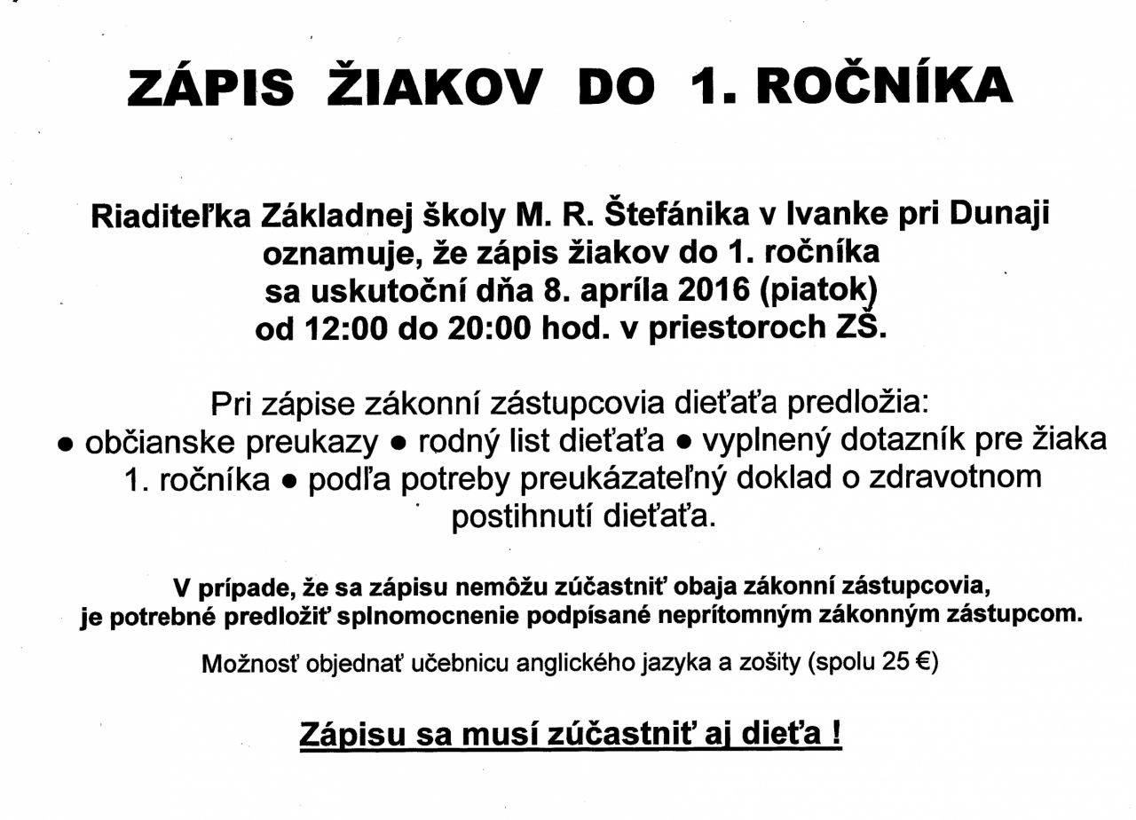 info k zápisu žiakov do 1. ročníka Oznam riaditeľky ZŠ Ivanka pri Dunaji o zápise žiakov do 1. ročníka