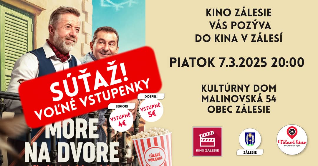 Milí susedia, kino Zálesie už najbližší v piatok so SÚŤAŽOU na facebooku o VOĽNÉ VSTUPENKY. Napíš s kým by si išla alebo išiel do kina, zdieľaj príspevok a môžeš vyhrať dva VOĽNÉ VSTUPY na film do Zálesia. Srdečne vás pozývame na úplne novú českú komédiu MORE NA DVORE do Zálesia. V piatok 7.3.2025 o 20:00. Vstupenky online ale aj na mieste. Tešíme sa na Vás